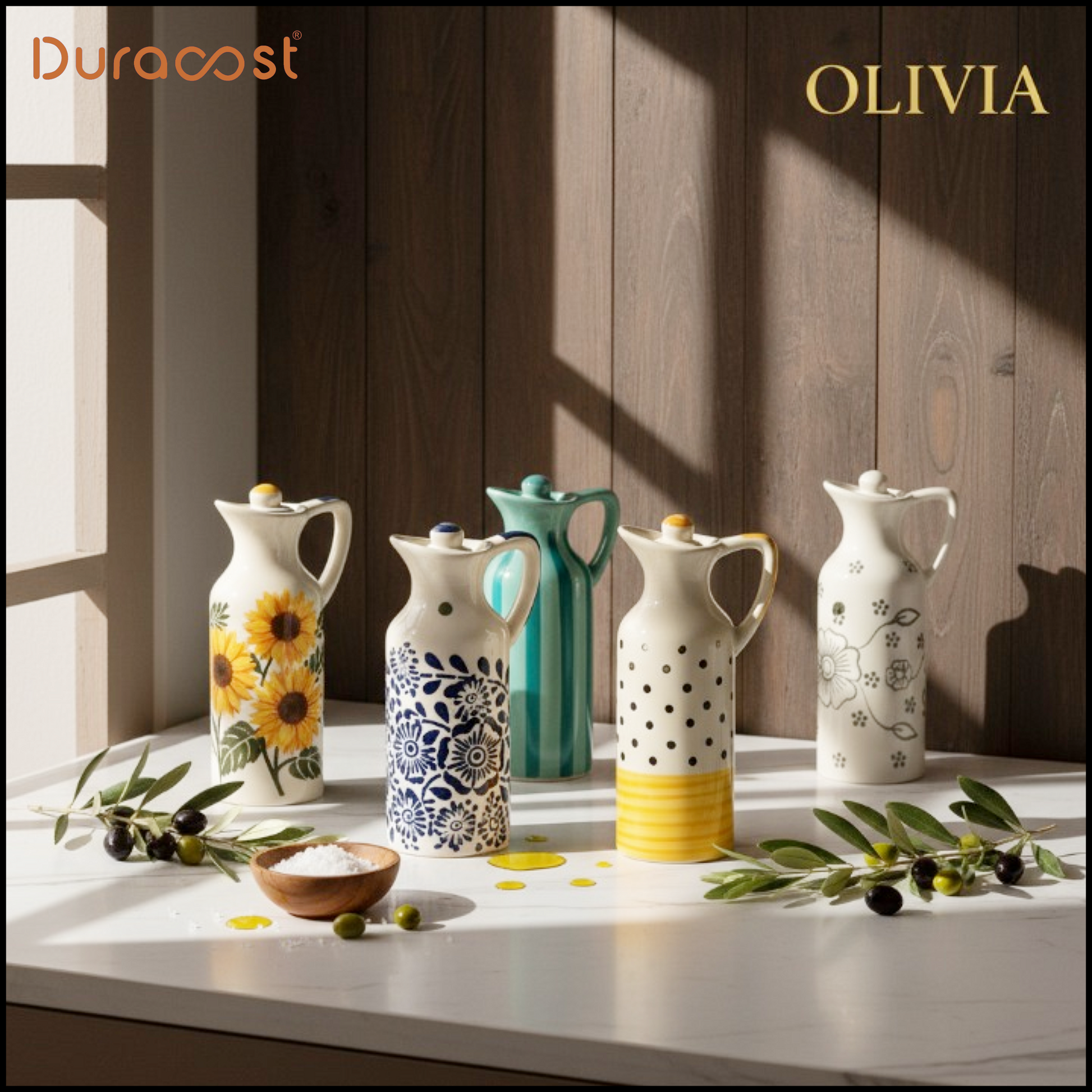 DuraCast® Olivia Ceramic Oil Bottle Set of 2 – 300ml Designer Olive Oil & Vinegar Dispenser with Handle & Lid | Assorted Handcrafted Patterns