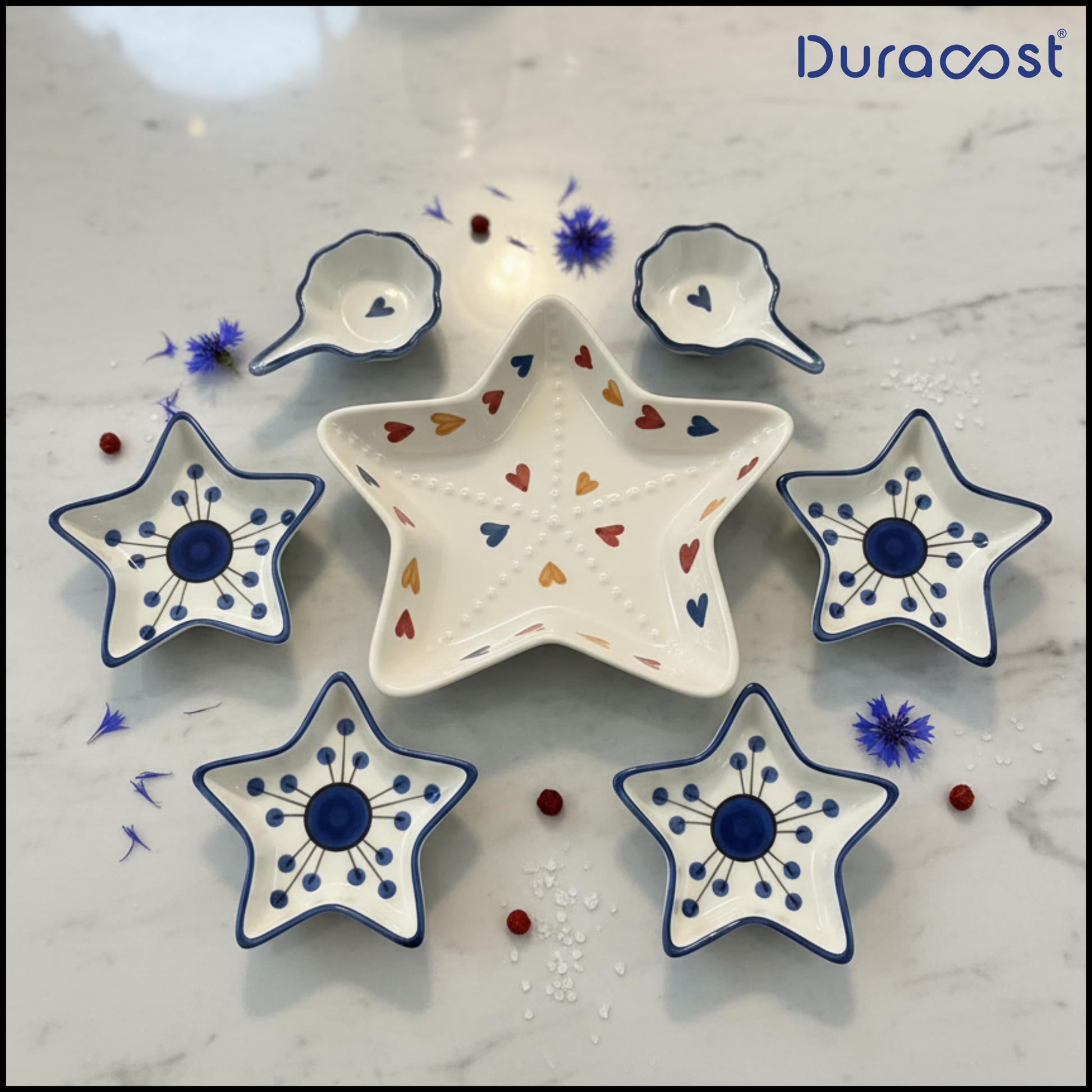 DuraCast® ChaatStar 7-Piece Ceramic Serving Set | Star-Shaped Snack Plates, Chutney Bowls & Large Chaat Platter | Red/Blue Variants