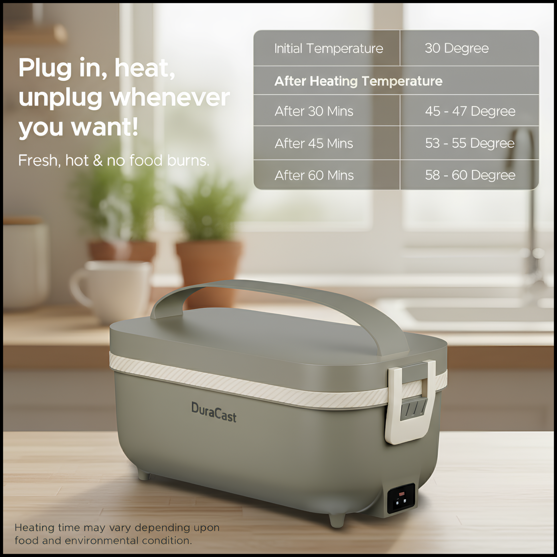 Enjoy fresh, hot, and home-like meals anywhere with the DuraCast® DuraMunch, a premium electric lunch box designed for modern professionals and students who value both style and functionality.
